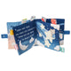 The Starry Night Teddy sleepy time soft book measures 6 x 6 inches and has 8 pages with a Velcro closure. The cover shows a soft fabric sleepy bear applique, and the pages shift from light to deep night blue as you turn them. Filled with fun tags for little hands to explore, plus crinkle paper and a squeaker for extra sensory delight. Perfect for bedtime stories with your baby, and easy to clean—just machine wash and air dry.