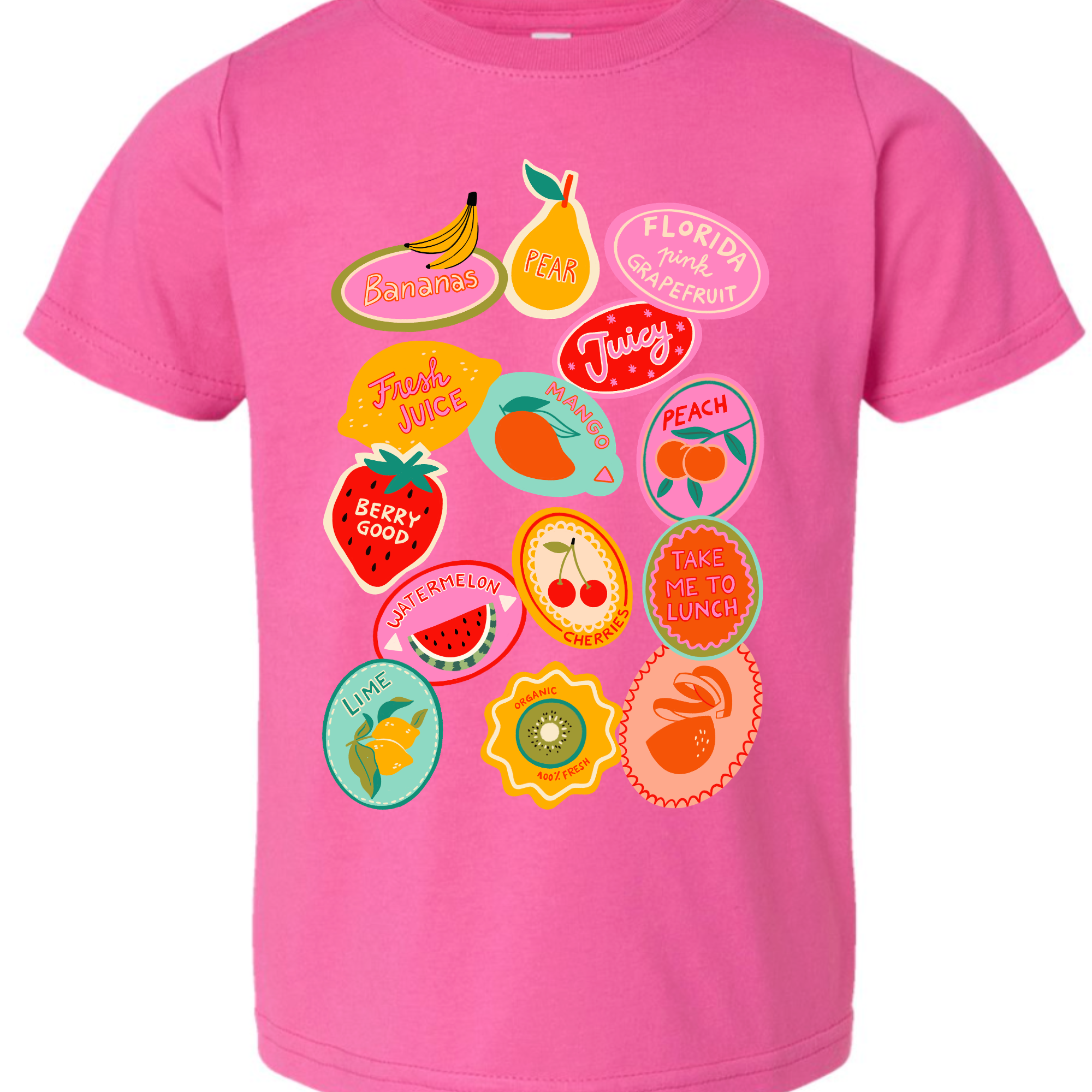 Sweet, juicy, and made for sunshine days. This bright pink graphic tee is bursting with colorful fruit-inspired patches — from “Berry Good” strawberries to “Take Me To Lunch” and “Fresh Juice” favorites. It’s giving farmers market meets summer fun.