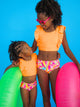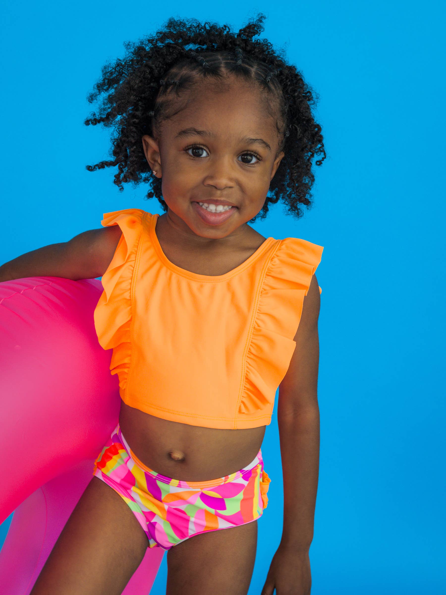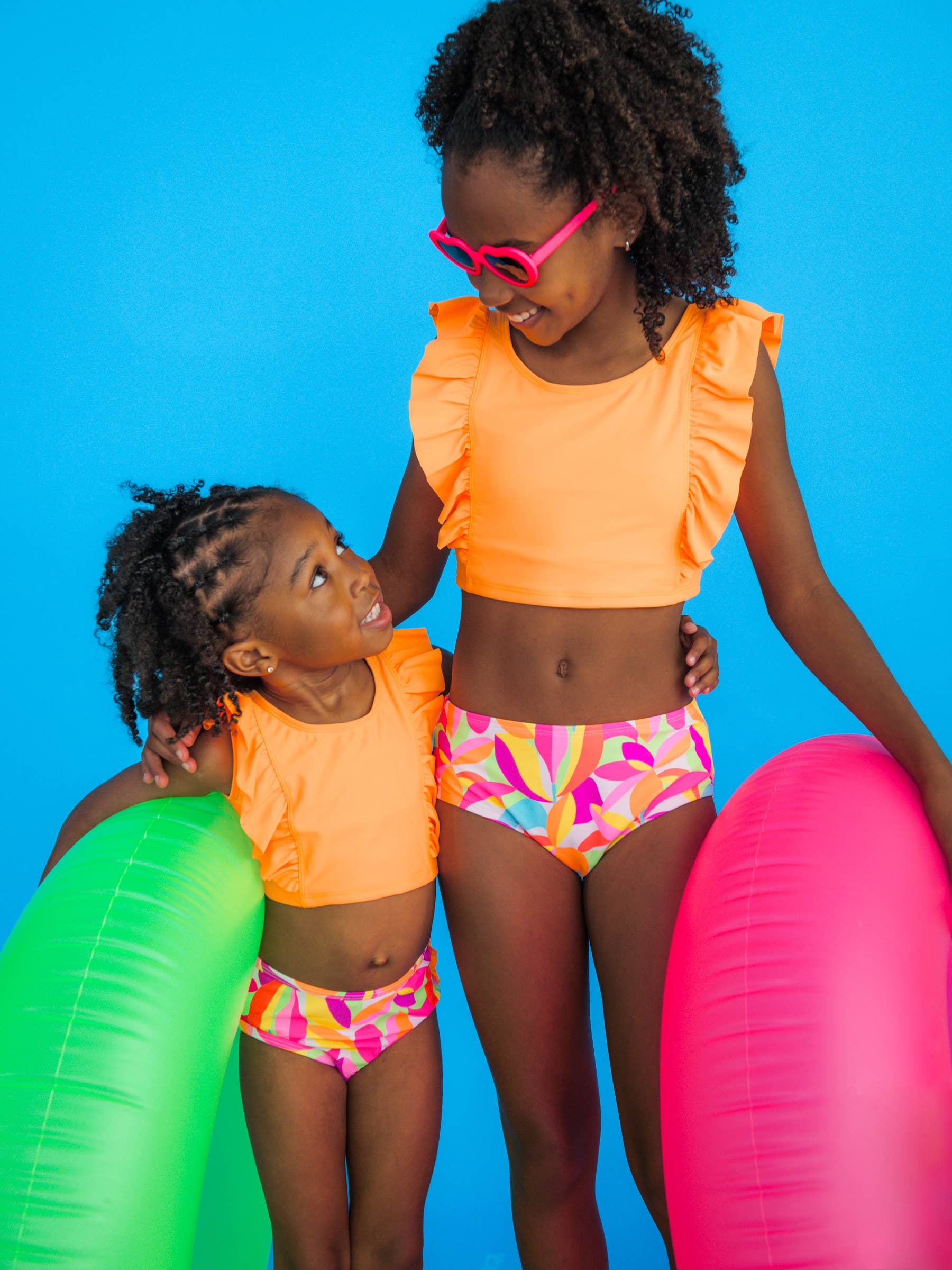 Let your little one make a splash in this vibrant tropical tankini designed for both style and sun safety. The eye-catching neon waterfall pattern brings playful energy to any poolside moment, while the signature rear ruffles and charming bow detail add that extra touch of personality. Built-in UPF 50+ protection keeps her skin shielded from harmful rays, so you can focus on the fun. This two-piece suit coordinates beautifully with our coordinating neon shades—Neon Orange, Neon Magenta, Bright Aqua, Neon Pink, Neon Honeydew, and Neon Yellow—making it easy to mix, match, and create her perfect summer look.