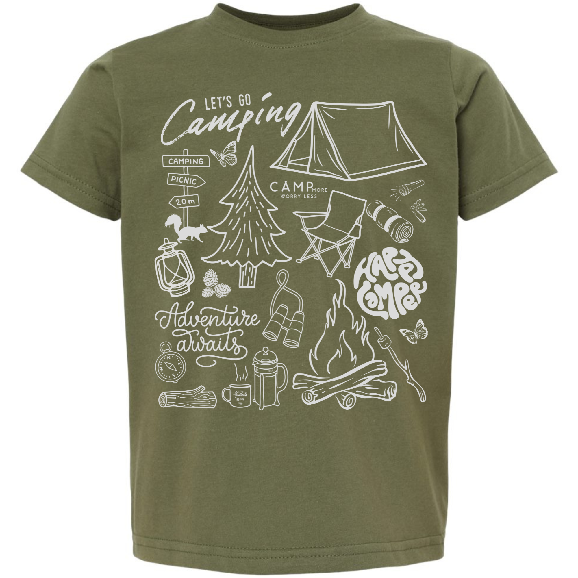 This “Let’s Go Camping” graphic tee is made for little explorers with big imaginations. Featuring hand-drawn camping icons — a tent, campfire, binoculars, lantern, tree, compass, and even a little woodland squirrel — this tee brings all the adventure vibes without leaving the backyard.