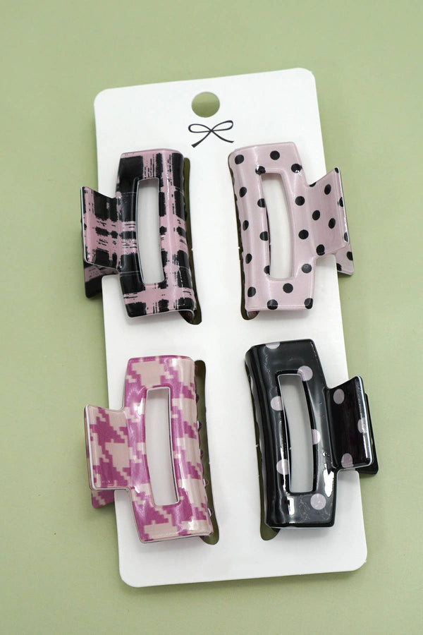 Set of 4 Mini Rectangle Hair Claw Clips. Checker or Strawberry Patterns. Featuring a mix of playful checker and sweet strawberry patterns, these mini clips are perfect for creating cute, effortless looks or adding decorative accents to your everyday style. Compact yet sturdy, they hold small sections of hair securely without slipping. Great for all ages and perfect for mixing, matching, or gifting!
