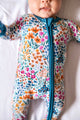 Snuggle up in the Whispering Wildflowers Romper, where adorable floral style meets ultimate comfort! Crafted from a dreamy 95% bamboo and 5% spandex blend, this long-sleeve romper feels like a gentle hug against baby's delicate skin. The clever double zipper makes diaper changes a breeze from either direction, while built-in zipper guards keep precious skin protected. Cozy fold-over mittens on every size prevent scratches and keep tiny hands toasty, and the convertible feet let you switch from footed to footless whenever you want. Starting at 6 months, grippy soles give crawlers and walkers the traction they need. Perfect for playtime, naptime, or any time in between!