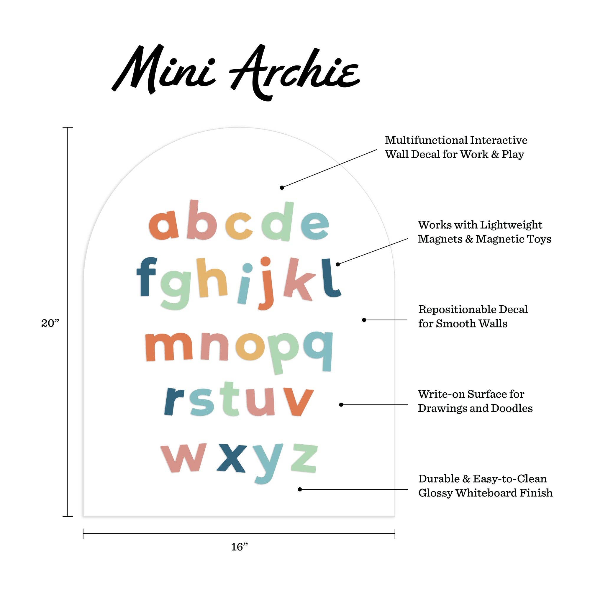 Bring organization and creativity together with our White Mini Arch Magnetic Wall Decal—a compact 16x20" solution designed for small spaces that demand big functionality. Perfect for nurseries, playrooms, dorm rooms, and classroom corners, this magnetic surface lets you display letters, notes, and visual aids while the write-on finish supports doodling, reminders, and learning activities. The repositionable adhesive sticks securely to smooth walls without permanent commitment, so you can refresh your space whenever inspiration strikes. Lightweight, versatile, and beautifully designed, it's the smart way to combine storage, creativity, and style in tight quarters.