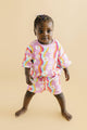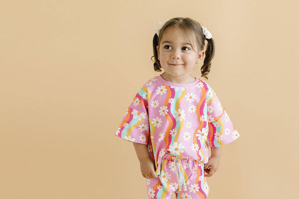 Let your little one shine in our Groovy Daisy shorts set—a vibrant celebration of color and comfort. This playful two-piece features a bold floral print that captures sunny days and carefree moments. Crafted from our signature silky cotton blend, the fabric delivers a smooth, breathable feel that keeps kids comfortable from morning to night while maintaining its shape through countless washes. Perfect for warm-weather adventures, casual playdates, or simply making a style statement, this set combines eye-catching design with everyday wearability. Give your child the confidence to stand out with a look that's as fun as they are.