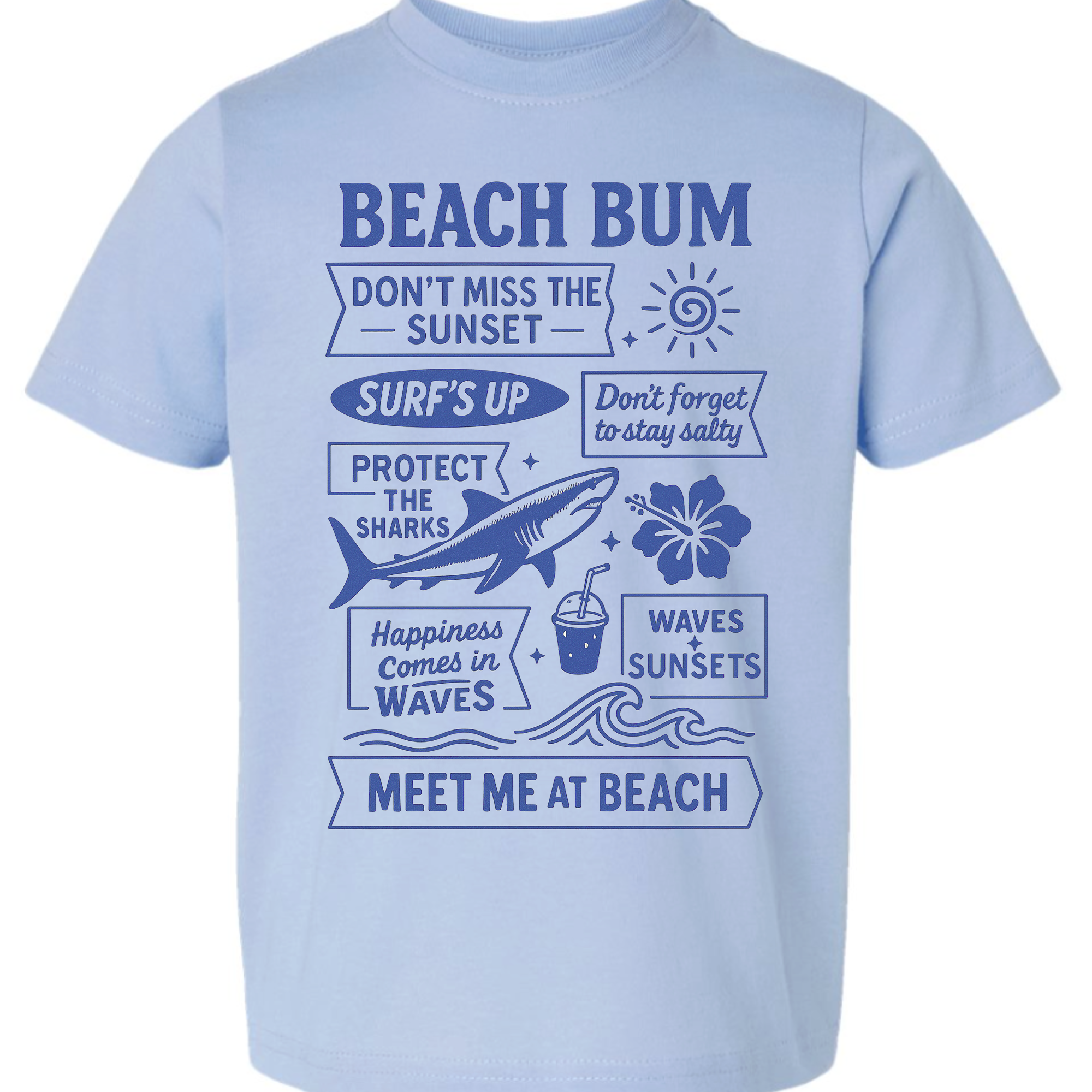 Featuring playful surf-inspired phrases like “Surf’s Up,” “Protect the Sharks,” and “Happiness Comes in Waves,” this tee brings all the laid-back summer energy. The soft blue color paired with bold navy graphics makes it an easy, everyday favorite.