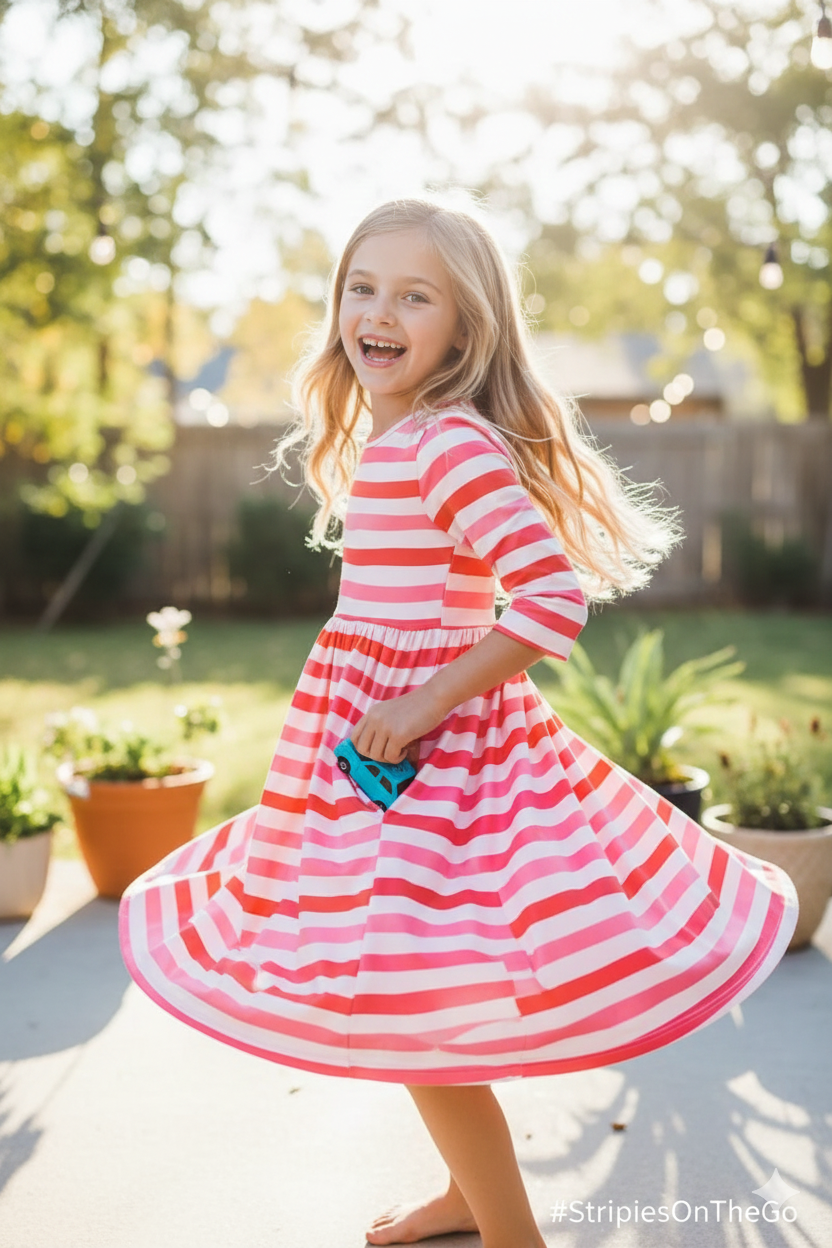 With hidden side pockets, kids have a special place to keep small treasures close. Stylish, comfortable, and endlessly fun—this striped twirl dress is an instant favorite for any young wardrobe.